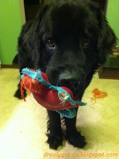 One of his other hobbies is pretending he is a lap dog. He is actually quite small for a Newfie, weighing in at about 115 lbs. But he is still big enough that it feels like he's going to crush my lungs when he lies on top of me. He's learned that that's one of the most effective ways to wake me up in the morning. It's a delight. He doesn't ever seem that big to us, since we see him every day. But judging from number of times we've heard the comment, "You should get a saddle for him!" and by the terrified eyes of non-dog-lovers when we approach their vicinity, he's larger than your average dog.